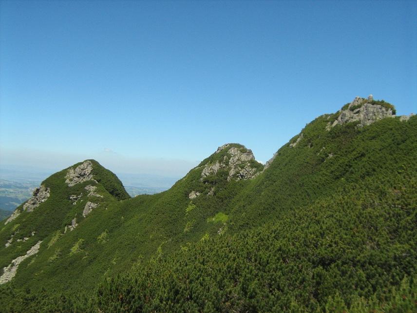 - Alsó képsor, bal: A mellékgerinc, melynek nyugati oldalán a zöld jelzés fut. A kép jobb szélen a Sucha Czuba (Száraz-halom, 1696 m).