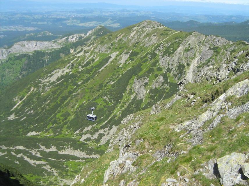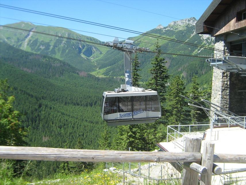 - Felső képsor, bal: Felvonó indul a csúcsra a Myślenickie Turnie (Myślenicei-tornyok) átszállóállomásról. A háttérben a Giewont.