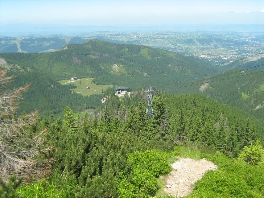 Nagyjából egy óra séta után aztán a jelzés nagy ívben jobbra kanyarodik, majd újabb 15 perc után eléri a felvonó átszálló állomását, azaz a Myślenickie Turnie-t (Myślenicei-tornyok, 1360 m). Itt a lanovkára beszállni NEM lehet.