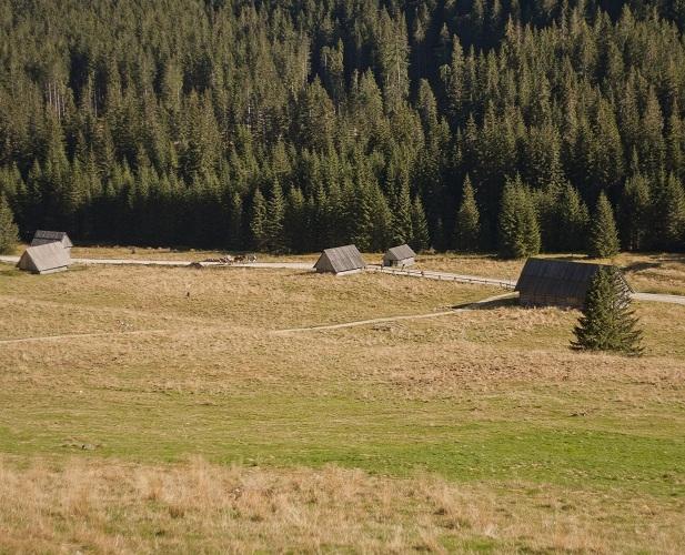 - Alsó képsor, bal: Bacówka a Huciska Polanan (Huta-rét).